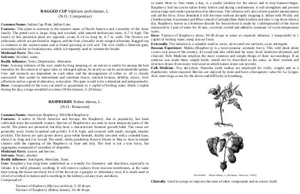 Common Names: Indian Cup Plant, Indian Gum. Features: This plant is common to the western states of North America and a member of the Aster family. The pitted root is large, long and crooked, with smooth herbaceous stem, 4 – 7 ft. high. The leaves of this perennial plant are opposite, ovate, 8 – 14 in. long by 4 – 7 in. wide. The flowers are yellowish, which are perfected in August, and the fruit a broadly ovate winged achenium. Ragged cup is common to the western states and is found growing in rich soil. The root yields a bitterish gum, somewhat similar to frankinscense, which is frequently used to sweeten the breath. Medicinal Parts: The root. Solvents: Alcohol, water. Bodily Influence: Tonic, Diaphoretic, Alterative. Uses: A strong infusion of the root, made by long steeping, or an extract is said to be among the best remedies for the removal of ague cake, or enlarged spleen. As nearly as can be ascertained the spleen, liver and stomach are dependent on each other and the derangement of either or all is closely associated. Also useful in intermittent and remittent fevers, internal bruises, debility, ulcers, liver affections and as a general alterative, restorative. The gum is said to be a stimulant and antispasmodic. Dose: 1 teaspoonful of the root, cut small or granulated, to 1 cupful of boiling water. Drink 1 cupful during the day, a large mouthful at a time. Of the tincture, 5 – 20 drops.