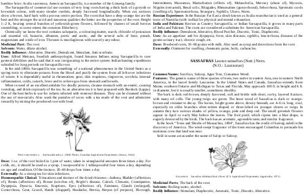 Common Names: Saxifrax, Saloop, Ague Tree, Cinnamon Wood. Features: The generic name of three species of trees, two native to eastern Asia, one to eastern North America, in the laurel family Lauraceae. In the United States and Canada, Sassafras extends from Maine, southern Ontario and Michigan to Texas and Florida. May approach 100 ft. in height and 6 ft. in diameter, but it is usually smaller, sometimes shrubby.