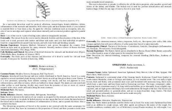 As a successful decoction used for pectoral affections, menorrhagia, female debilities, whites, inflammation of the stomach and intestines. Will relieve pain and heal haemorrhoids if a tea solution is injected three or four times a day. An agent for obvious conditions such as erysipelas, itch, etc.; also of use in neuralgia and ruptures when taken internally and an external poultice applied to painful area. Dose: 1 oz. of the root to 1 pint of boiling water, taken in wineglassful amounts. Externally: The extract from the root is used to diminish freckles and discoloration of the skin. If the fresh root is used, proceed with caution and dilute with water until you find individual acceptance. Used for congested blood caused from bruises, and will close fresh and bleeding wounds. Russian Experience: Koopena Medical, Solomon’ s seal, grows throughout the country. Folk Medicine have used its properties for many centuries. Recently modern science of Russia has been interested( Zemlinsky, 1951; Hopp, 1958). Folk Medicine and Clinical: Decoction of the dried rhizome for stomach and duodenal ulcer( Popov, 1964)( Bello-Russ. Academy of Science, 1965). Externally: The fresh juice of the rhizome and decoction of it dried is useful for old and fresh wounds. Fresh juice for freckles( Cholovsky, 1888).