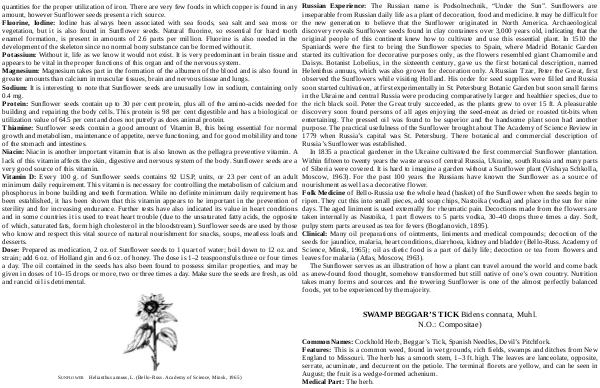 quantities for the proper utilization of iron. There are very few foods in which copper is found in any amount, however Sunflower seeds present a rich source. Fluorine, Iodine: Iodine has always been associated with sea foods, sea salt and sea moss or vegetation, but it is also found in Sunflower seeds. Natural fluorine, so essential for hard tooth enamel formation, is present in amounts of 2.6 parts per million. Fluorine is also needed in the development of the skeleton since no normal bony substance can be formed without it. Potassium: Without it, life as we know it would not exist. It is very predominant in brain tissue and appears to be vital in the proper functions of this organ and of the nervous system. Magnesium: Magnesium takes part in the formation of the albumen of the blood and is also found in greater amounts than calcium in muscular tissues, brain and nervous tissue and lungs. Sodium: It is interesting to note that Sunflower seeds are unusually low in sodium, containing only 0.4 mg. Protein: Sunflower seeds contain up to 30 per cent protein, plus all of the amino-acids needed for building and repairing the body cells. This protein is 98 per cent digestible and has a biological or utilization value of 64.5 per cent and does not putrefy as does animal protein. Thiamine: Sunflower seeds contain a good amount of Vitamin B, this being essential for normal growth and metabolism, maintenance of appetite, nerve functioning, and for good mobilility and tone of the stomach and intestines. Niacin: Niacin is another important vitamin that is also known as the pellagra preventive vitamin. A lack of this vitamin affects the skin, digestive and nervous system of the body. Sunflower seeds are a very good source of this vitamin. Vitamin D: Every 100 g. of Sunflower seeds contains 92 U. S. P, units, or 23 per cent of an adult minimum daily requirement. This vitamin is necessary for controlling the metabolism of calcium and phosphorus in bone building and teeth formation. While no definite minimum daily requirement has been established, it has been shown that this vitamin appears to be important in the prevention of sterility and for increasing endurance. Further tests have also indicated its value in heart conditions and in some countries it is used to treat heart trouble( due to the unsaturated fatty acids, the opposite of which, saturated fats, form high cholesterol in the bloodstream). Sunflower seeds are used by those who know and respect this vital source of natural nourishment for snacks, soups, meatless loafs and desserts. Dose: Prepared as medication, 2 oz. of Sunflower seeds to 1 quart of water; boil down to 12 oz. and strain; add 6 oz. of Holland gin and 6 oz. of honey. The dose is 1 – 2 teaspoonsfuls three or four times a day. The oil contained in the seeds has also been found to possess similar properties, and may be given in doses of 10 – 15 drops or more, two or three times a day. Make sure the seeds are fresh, as old and rancid oil is detrimental.