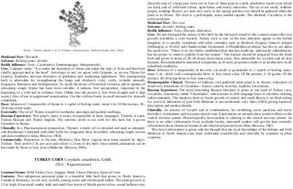 Medicinal Part: The herb. Solvents: Boiling water, alcohol. Bodily Influence: Tonic, Carminative, Emmenagogue, Antispasmodic. Uses: Culpeper states:“ It is under the dominion of Venus and under the sign of Aries and therefore chiefly appropriated to the head”. Astrology or not, we agree with Culpeper, as we use Thyme for hysteria, headache, nervous disorders of giddiness and weakening nightmares. This unsuspecting herb is admirable for strengthening the lungs and children’ s colic, colds, irritable stomach, dyspepsia, flatulence and ill-disposition. To sooth the throat of bronchial irritation and in spasms of whooping cough, thyme has been most reliable; it induces free perspiration, important to the beginning of a cold and in ordinary fever.( Make sure the person is free from draught and is kept warm.) Also of use in suppressed menstruation. Use the cold tea freely in small amounts for stomach complaints. Dose: Infusion of 1 teaspoonful of thyme to 1 cupful of boiling water; steep ½ hr. Of the tincture, 20 – 50 drops in hot water. Externally: The oil of Thyme is used for toothache, neuralgia and painful swellings. Russian Experience: This plant’ s name is easily recognizable in three languages: Thymus is Latin, Timian Russian and Thyme English. The extreme north is too cold for this herb but it grows elsewhere in Russia. Clinically: In a Pharmacopoeial preparation, Thymol, volatile oil is extracted and used as antiseptic and disinfectant. Combined with other herbs for congested chest, bronchitis, whooping cough, worms and skin conditions( Atlas, Moscow, 1963). Commercially: Plantations in Ukraine, Moldavia, Don River regions have been assisted by Agro- Technic. They seed 4 – 5 lb. per acre and collect 1 – 2 tons of dry herb. Once seeded, plantations can be harvested for three or four years( Medicine, Moscow, 1965).