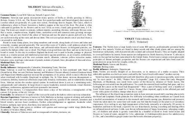 Found in many damp places, low-lying meadows and woods, along banks of rivers and lakes and in marshy, swampy ground generally. The carrot-like roots of V. edulis, a tall glabrous plant of the western U. S. A. with undivided stem leaves, and yellowish-white flowers in elongated panicles, are eaten by the Indians either raw or dried. The Piutes even grind them into flour and use in the form of bread or mush. To this day in northern England the dried root is used in broths, pottage or physical meats as a counter-poison and medicinal preservative against pestilence, as are treacles, mithridates, etc. Besides valerianic acid the root contains starch, albumen, valerian yellow extractive matter, balsamic resin, mucilage, valerianate of potash, malates of potash, lime, phosphate of lime and silica. Medicinal Part: The root. Solvent: Water. Bodily Influence: Antispasmodic, Calmative, Stimulating Tonic, Nervine. Uses: Valerian is used by Herbalists today as a nerve tonic. Is best combined with Skull cap( Scutellaria), Blue vervain( Verbena hastata), and Mistletoe( Viscum album). Gentian( Gentiana lutea) and Peppermint( Mentha piperita) increase the promptness of its action, which is more effective than when combined with bromide. Employed in epileptic fits, St. Vitus dance, nervous derangement or irritations, debility, hysterical affections( especially female), restlessness, and in wakefulness during fever. Valerian excites the cerebro-spinal system. In medicinal doses it acts as a stimulating tonic, antispasmodic and calmative. In large doses it causes headaches, mental excitement, visual illusions, giddiness, restlessness, agitation and even spasmodic movement. Dose: Of the tincture, 1 – 2 teaspoonfuls three times a day; of the infusion, a wineglassful; of the extract, 3 – 6 grains; of the oil, 5 drops. Externally: An infusion of ½ cupful of the root can be used in the bath to relieve nervous exhaustion. Russian Experience: Valeriana is known to Folk Medicine as having a general calming and sedative effect on the central nervous system, to induce sleep and rest, spasms of the stomach, intestines and blood vessels, nervous heart conditions. Further acknowledgement as appetizer, headache relief, hysteria, epilepsy, tape worm, diarrhoea, lose stomach, fever. Externally: Vapour baths given to children will quieten and encourage restful sleep( Bello-Russ. Academy of Science, Minsk, 1965). Clinically: Extracts of Valerian are used in compounds of tablets, tinctures, etc.