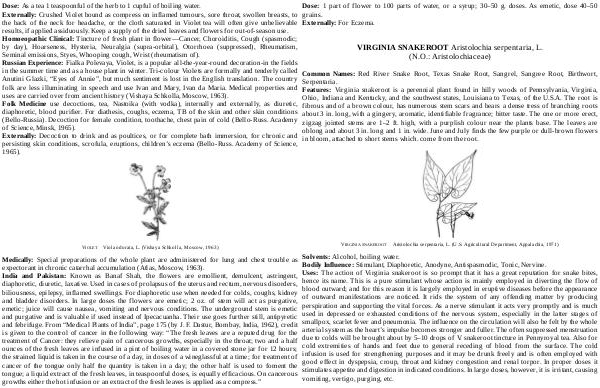 Solvents: Alcohol, boiling water. Bodily Influence: Stimulant, Diaphoretic, Anodyne, Antispasmodic, Tonic, Nervine. Uses: The action of Virginia snakeroot is so prompt that it has a great reputation for snake bites, hence its name. This is a pure stimulant whose action is mainly employed in diverting the flow of blood outward; and for this reason it is largely employed in eruptive diseases before the appearance of outward manifestations are noticed. It rids the system of any offending matter by producing perspiration and supporting the vital forces. As a nerve stimulant it acts very promptly and is much used in depressed or exhausted conditions of the nervous system, especially in the latter stages of smallpox, scarlet fever and pneumonia. The influence on the circulation will also be felt by the whole arterial system as the heart’ s impulse becomes stronger and fuller. The often suppressed menstruation due to colds will be brought about by 5 – 10 drops of V. snakeroot tincture in Pennyroyal tea. Also for cold extremities of hands and feet due to general receding of blood from the surface. The cold infusion is used for strengthening purposes and it may be drunk freely and is often employed with good effect in dyspepsia, croup, throat and kidney congestion and renal torpor. In proper doses it stimulates appetite and digestion in indicated conditions. In large doses, however, it is irritant, causing vomiting, vertigo, purging, etc.