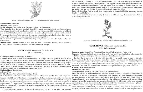 Common Names: Tall Nasturtium, Water Cress. Features: Water cress is of the mustard family native to Europe, but has migrated to most of North America and is found in moist banks and running waters below 8,000 ft. The branching stems are 1 – 3 ft. long and generally extended with leaves above the water. The leaves are somewhat fleshy, elliptic and in pairs of three to seven with small white flowers in enlongated racemes; pods ½ – 1 in. long. Water cress is most popular as a garnish only; the mineral-rich plant is an excellent addition to daily salads. Has been in use as this by people since ancient times. Medicinal Parts: Leaves, root. Solvent: Water. Bodily Influence: Tonic, Stimulant, Blood purifying. Uses: The American Indians used the herb for liver and kidney trouble and to dissolve kidney stones. Parkinson, in 1640, says:“ The leaves of juice applied to the face or other parts troubled with freckles, pimples, spots or the like at night and washed away in the morning. The juice mixed with vinegar to the forehead is good for lethargy or drowsy feeling.” For the above use the fresh herb daily for skin improvement. The high content of the vitamin and mineral part is a preventive for scurvy, and a blood builder in every sense of the word. The Romans considered it as excellent food for those who have deranged minds.
