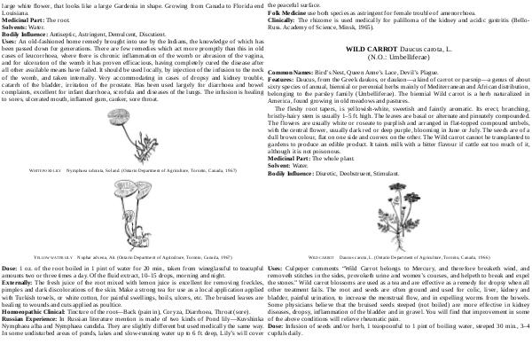 Dose: 1 oz. of the root boiled in 1 pint of water for 20 min., taken from wineglassful to teacupful amounts two or three times a day. Of the fluid extract, 10 – 15 drops, morning and night. Externally: The fresh juice of the root mixed with lemon juice is excellent for removing freckles, pimples and dark discolorations of the skin. Make a strong tea for use as a local application applied with Turkish towels, or white cotton, for painful swellings, boils, ulcers, etc. The bruised leaves are healing to wounds and cuts applied as poultice. Homoeopathic Clinical: Tincture of the root— Back( pain in), Coryza, Diarrhoea, Throat( sore). Russian Experience: In Russian literature mention is made of two kinds of Pond lily— Kuvshinka Nymphaea alba and Nymphaea candida. They are slightly different but used medically the same way. In some undisturbed areas of ponds, lakes and slow-running water up to 6 ft. deep, Lily’ s will cover
