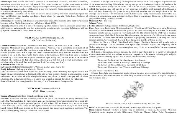 Common Names: Mechameck, Wild Potato, Man Root, Man of the Earth, Man in the Ground. Features: Mechameck belongs to the United States of America. This is a climbing perennial herb of the Morning glory family. The root is very large and tapering from which arise several long, round, slender, purplish stems, 4 – 8 ft. high. The leaves are cordate at the base, alternate and acuminate and about 2 – 3 in. long, The large white flower opens in the forenoon; flowering from June to August, followed by a two-celled fruit capsule. Thrives in light, sandy soil, seldom found in the northern latitudes. The roots can be dug when young shoots appear but it is best to wait until autumn, after aerial stems have decayed, then wash, peel and dry( if necessary over fire). Medicinal Part: The root. Solvents: Diluted alcohol( completely), Water, or alcohol alone( partially). Bodily Influence: Hydragogue, Cathartic, Diuretic. Uses: The influence seems to be especially useful for lungs, liver and kidney. Equal parts of root and Skunk cabbage( Symplocarpus foetidus) made into a syrup is very effective in consumption, cough and asthma. An infusion, taken in wineglassful doses every hour, is useful in dropsy and calculous affections. The milky juice of the root is said to be a protection against the bite of the rattlesnake. Dose: Of the infusion, wineglassful or less every 3 hr. Of the tincture, 2 teaspoonfuls.