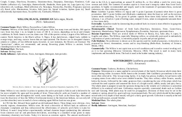 Common Names: Black Willow, Pussywillow, Catkin Willow. Features: Willow, of the family Salicaceae and genus Salix, has many trees and shrubs; 300 species vary from less than 1 in. in height to trees of 100 ft. or more, depending on local and climatic conditions. In North America we can claim over 100 of the species variety. Largest of the Willows of eastern North America is the Black willow S. Nigra. It has dark-brown, ridged bark, reddish to orange twigs, and long, narrow leaves that are taper-pointed. The flowers are in elongated clusters, aments or catkins, of two different types; however, in rare instances, the flowers are bisexual. The“ precocious” catkins are ornamental, and among flowering plants Willow is ancient, fossils extending back to the Cretaceous. Medicinal Part: The bark. Solvent: Boiling water. Bodily Influence: Aphrodisiac, Tonic, Astringent, Detergent, Anti-periodic.