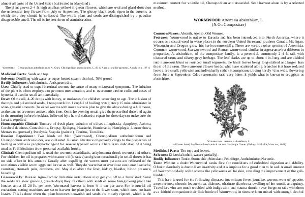 Medicinal Parts: The tops and leaves. Solvents: Diluted alcohol, water( partially). Bodily Influence: Tonic, Stomachic, Stimulant, Febrifuge, Anthelmintic, Narcotic. Uses: Without a doubt Wormwood ranks first for conditions of enfeebled digestion and debility. Often melancholy is due to liver inactivity and it is impious for a good man to be sad. A small amount of Wormwood daily will decrease the yellowness of the skin, revealing the improvement of the gallbladder.