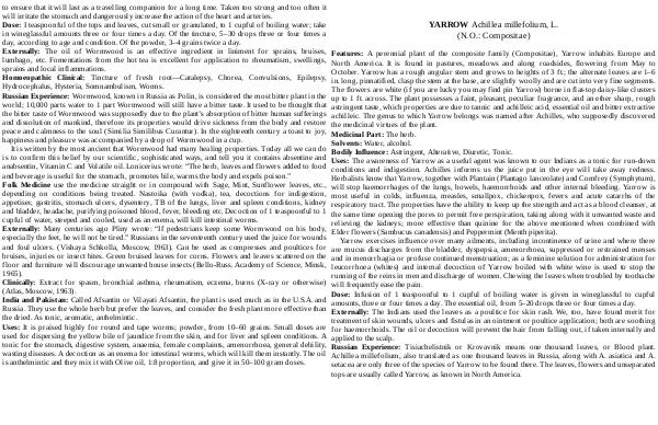 Yarrow exercises influence over many ailments, including incontinence of urine and where there are mucus discharges from the bladder, dyspepsia, amenorrhoea, suppressed or restrained menses and in menorrhagia or profuse continued menstruation; as a feminine solution for administration for leucorrhoea( whites) and internal decoction of Yarrow boiled with white wine is used to stop the running of the reins in men and discharge of women. Chewing the leaves when troubled by toothache will frequently ease the pain. Dose: Infusion of 1 teaspoonful to 1 cupful of boiling water is given in wineglassful to cupful amounts, three or four times a day. The essential oil, from 5 – 20 drops three or four times a day. Externally: The Indians used the leaves as a poultice for skin rash. We, too, have found merit for treatment of skin wounds, ulcers and fistulas in an ointment or poultice application; both are soothing for haemorrhoids. The oil or decoction will prevent the hair from falling out, if taken internally and applied to the scalp. Russian Experience: Tisiachelistnik or Krovavnik means one thousand leaves, or Blood plant. Achillea millefolium, also translated as one thousand leaves in Russia, along with A. asiatica and A. setacea are only three of the species of Yarrow to be found there. The leaves, flowers and unseparated tops are usually called Yarrow, as known in North America.