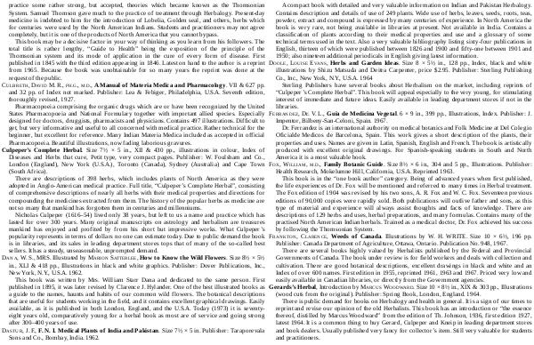 There are several books highly valued by Herbalists published by the Federal and Provincial Governments of Canada. The book under review is for field workers and deals with collection and cultivation. There are good botanical descriptions, excellent drawings in black and white and an Index of over 600 names. First edition in 1955, reprinted 1961, 1963 and 1967. Priced very low and easily available in Canadian libraries, or directly from the Government agencies.