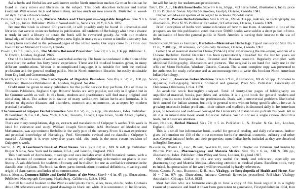 Because this book is almost 100 years old, it will possibly only be found in universities and libraries that were in existence before its publication. All students of Herbalogy who have a chance to study in such a library or obtain the book will be rewarded greatly. As with our modern knowledge of herbs, the old books give a new light. In many cases recent scientific discovery has already been recorded in the yellowed pages of the oldest hooks. Our copy came to us from our friend Darrel Markel of Toronto, Canada.