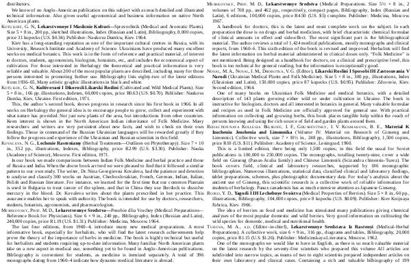 KOTUKOV, G. N., Kultivovani I Dikorosli Likarski Roslini( Cultivated and Wild Medical Plants). Size 5 × 8 in., 166 pp. illustrations, Indexes, 60,000 copies, price R0.63( U. S. $ 0.70). Publisher: Naukova Dumka, Kiev, Ukraine. First edition, 1971.