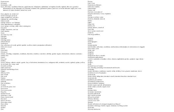 FEATHER: few; foil Febricide Febrifuge Febrifuge plant Febrile disease Feebleness Feet, affections of; easily galled; painful, swollen, tender; perspiration( offensive) Feller, Dr. Lloyd Felons Felon herb Felonwort Female, bleeding; complaints, conditions, disorders, troubles; corrective; debility; genital organs; obstructions; sickness; weakness Female fern Fennel Fern root Fertility Fevers; bilious; catheter; enteric; gastric; hay; of infections; intermittent; low; malignant; milk; remittent; scarlet; typhoid; typhus; yellow