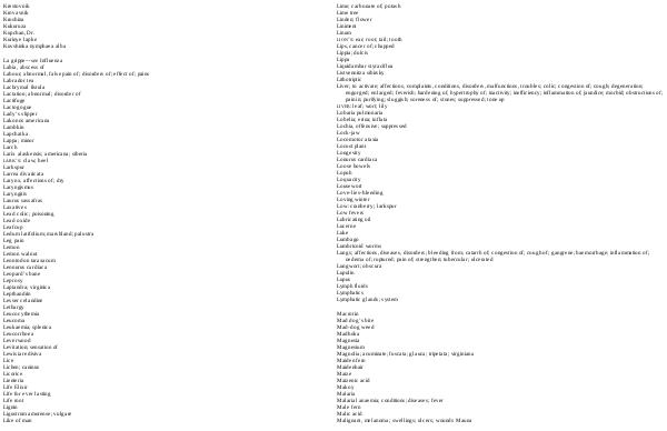 LARK’ S: claw; heel Larkspur Larrea divaricata Larynx, affections of; dry Laryngismus Laryngitis Laurus sassafras Laxatives Lead colic; poisoning Lead oxide Leafcup Ledum latifolium; marshland; palustra Leg pain Lemon Lemon walnut Leontodon taraxacum Leonurus cardiaca Leopard’ s bane Leprosy Laptandra; virginica Lepthandrin Lesser celandine Lethargy Leucocythemia Leucoma Leukaemia; splenica Leucorrhoea Leverwood Levitation; sensation of Lewisia rediviva Lice Lichen; caninus Licorice Lienteria Life Elixir Life for ever lasting Life root Lignin Ligustrum amurense; vulgare Like of man