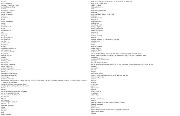 Mallow Malva sylvestris Mammary glands, to soften Mammillary swelling Mammitis Mandrake; American Man of the earth Man in the ground Man root Manganese Mania Maniacal delirium Manna Mannite Manzanita berries Maple Maple lungwort Mar Marasmus Marigold Marrubium vulgare Marshmallow Marsh tea Maryland pink Masterwort Mastitis Masturbation; effects of Mati i matcheha Matricaria chamomilla May apple Meadow sorrow Measles Mechameck Medicago sativa Melancholy Melanoma, malignant Menier’ s disease Meningeal headache Meningitic menses, suppressed Meningitis Menispermum canadense Menopause, irregularities Menorrhagia Menstrual secretions Menstruation, breasts painful during; delayed; disorders; excessive; irregular; obstinate; obstructed; painful; profuse; promote; scanty; suppressed; vicarious Mental despondency; exhaustion; shock Mentha; piperita; pulegioides; spicata; viridis Mentol Menthol Mercurial poisoning; retention; salivation Mercurio-syphilitic affection Mercury; abuse of; effects of Metabolism Metritis Metrorrhagia