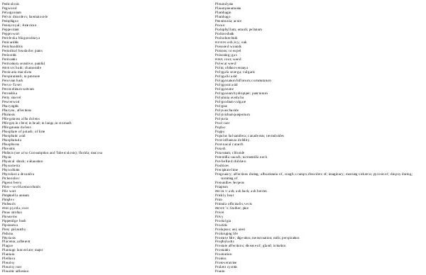 PRINCE’ S: feather; pine Privet Privy Proctalgia Proctitis Prolapsus; ani; uteri Prolonging life Promote bile; digestion; menstruation; milk; perspiration Prophylactic Prostate affections; disease of; gland; irritation Prostatitis Prostration Protein Protoveratrine Prulent cystitis Prunin