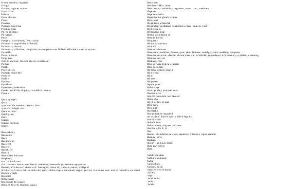 Relaxants Remittent chills; fever Renal colic; conditions; congestion; torpor; tract; weakness Repeinik Repeinoe maslo Reproductive glands; organs Resolvent Respiration, abnormal Respiratory conditions; congestion; organs; process; tract Restlessness Restorative tonic Retina, detachment of Retinitis bulism Rhagades Rhamnus purshiana Rhatany Rheum; palmatum Rheumatic conditions; disease; gout; joints; liniment; neuralgia; pains; swelling; symptoms Rheumatism; acute; chronic; chronic muscular; of deltoid; gonorrhoeal; inflammatory; syphilitic; wandering Rheumatism root Rhubarb; root Rhus cariaria; glabra; glabrum Rhus poisoning Riabinka obiknovennaya Rich-weed Ricin Rickets Ringworm Ripple grass Robin’ s rye