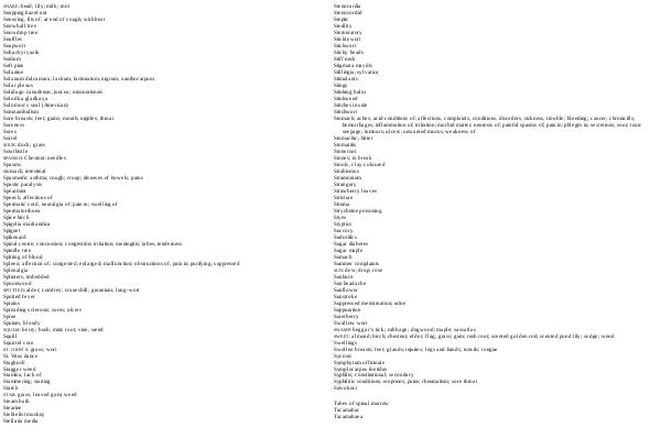 SWEET: almond; birch; chestnut; elder; flag; grass; gum; rush root; scented golden rod; scented pond lily; sedge; wood Swellings Swollen breasts; feet; glands; injuries; legs and hands; tonsils; tongue Sycosis Symphytum officinale Symplocarpus foetidus Syphilis; constitutional; secondary Syphilitic conditions; eruptions; pains; rheumatism; sore throat Szivokost