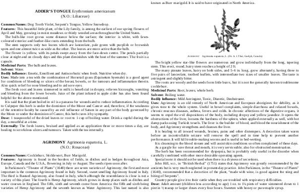 It is healing to all inward wounds, bruises, pains and other distempers. A decoction taken warm before an incontrollable seizure will remove the spell and in time help to prevent another performance. It will kill trouble-making worms and is useful in bed-wetting. It is cleansing to the blood stream and will assist skin conditions so often complained of these days. As a gargle for sore throat and mouth, it is very serviceable; also for obstructed menstruation. The herb has been recommended for dyspepsia, but is probably only useful in the disorder when carefully combined with other more desirable operating agents. Special note: it should not be used when there is a dryness of secretions. John Hill, M. D., in“ British Herbal”( 1751) states that Agrimony was greatly recommended by the ancients but is very much neglected in present-day practice. John Parkinson, in the“ Theatre of Plants”( 1640), recommended that a decoction of the plant,“ made with wine, is good against the sting and biting of Serpents”.