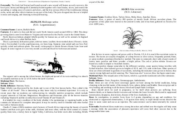 These properties change somewhat in the different varieties, some species being tree-like with forked branches. Aloe bainesii grows to heights of 65 ft. and 15 ft. wide at the base. Other species of Aloe are often cultivated in gardens of succulents, including the miniature ones grown in homes; they require strong light and careful watering. The“ American aloe” is not an Aloe, but Agave americana. Medicinal Part: The insipid juice of the leaves, which is a greenish translucent salve-like substance. Solvent: Water. Bodily Influence: Tonic, Purgative, Emmenagogue, Anthelmintic. Uses: Aloes are one of the most sovereign agents we have among the herbal medicines, being cleansing to the morbid matter of the stomach, liver, spleen, kidney and bladder. Does not gripe and is very healing and soothing to all the tissue, blood and lymph fluids it obliges.