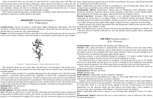 places. Dilute tincture dropped in the ears will kill worms therein. The root or seeds bruised and held on an aching tooth will relieve the pain. Dose: 1 teaspoonful of the herb cut small or granulated to 1 cup of boiling water; drink cold 1 cup during the day, a mouthful at a time. Of the tincture, 30 – 60 drops. Homoeopathic Clinical: Amenorrhoea, Antrum( pain in), Blepharitis, Colic( flatulent), Cough, Diarrhoea, Dysentery, Dysmenia, Dysuria Eczema, Epilepsy, Gonorrhoea, Gravel, Haemorrhoids, Heart( affections of), Hysteria, Laryngitis, Spleen( affections of), Strangury, Ulcers. Russian Experience: Arsesmart( Water pepper) is not cultivated commercially but the State encourages its preservation in its natural habitat. In all Russian medical and herbal literature, including general and medical encyclopedias, attention is given to several kinds of Polygonum, and one of them, Polygonum hydropiper( Water pepper-Vodianoy Peretz), is appraised for many things.