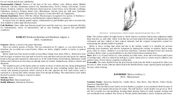 Uses: The earliest settlers brought barley to North America continent. Indian keen judgement taught them that this, as with other whole food that has not been deprived through soil degeneration and refinement and thus robbed of their natural elements, had the original composition created for maintaining the ultimate health of mankind. Barley is more cooling than wheat and due to the sodium content it is valuable for persons suffering from rheumatic and arthritic symptoms by keeping the calcium in solution. Barley water gives relief in fevers, children’ s re-occurrence diarrhoea, catarrhal inflamed bowel and stomach irritation. Barley water is a good addition to any diet of harmonious intestinal flora. Dose: Boil 2 oz. of pearl barley for a few minutes in a little water, strain and to the bariey add 4 pints of boiling water, which is reduced by boiling to 2 pints; lemon juice or raisins may be added to suit patient’ s taste, 10 min. before complete cooking time. Externally: The water distilled from the green barley fresh from the fields is prepared for film over the eyes or when in pain. Saturate white bread in the distilled barley water, squeeze gently and apply to the eyes, while relaxing.