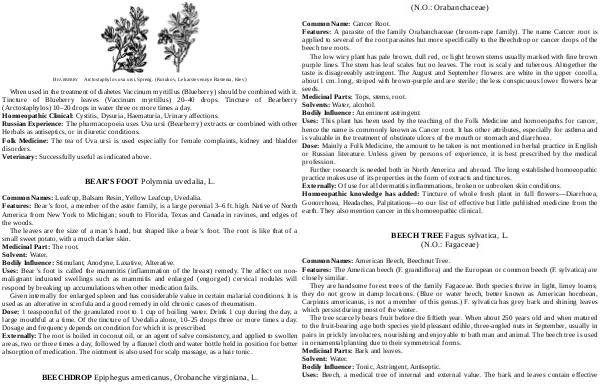 The tree scarcely bears fruit before the fiftieth year. When about 250 years old and when matured to the fruit-bearing age both species yield pleasant edible, three-angled nuts in September, usually in pairs in prickly involucres, nourishing and enjoyable to bath man and animal. The beech tree is used in ornamental planting due to their symmetrical forms. Medicinal Parts: Bark and leaves. Solvent: Water. Bodily Influence: Tonic, Astringent, Antiseptic. Uses: Beech, a medical tree of internal and external value. The bark and leaves contain effective