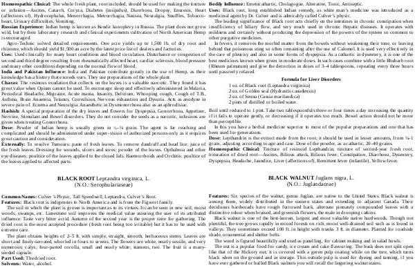 Agro-Technic solved detailed requirements. One acre yields up to 1,500 lb. of dry root and rhizome, which should yield $ 1,500 an acre by the latest price list of dealers and factories. Uses: Used clinically for many heart conditions and blood circulation. Disturbance or congestion of second and third degree resulting from rheumatically affected heart, cardiac sclerosis, blood pressure and many other conditions depending on the normal flow of blood. India and Pakistan Influence: India and Pakistan contribute greatly in the use of Hemp, as their knowledge has a history that exceeds ours. They use preparations of the whole plant. Charas: The resinous exudation that collects on the leaves is a valuable narcotic. They found it has great value when Opium cannot be used. To encourage sleep and effectively administered in Malaria, Periodical Headache, Migraine, Acute mania, Insanity, Delirium, Whooping cough, Cough of T. B., Asthma, Brain Anaemia, Tetanus, Convulsion, Nervous exhaustion and Dysuria. Acts as anodyne in severe pain of. Eczema and Neuralgia. Anaesthetic in Dysmenorrhoea also as an aphrodisiac. Hashish: A special preparation of the dry leaves and flowers for Dyspepsia, Gonorrhoea, Appetizer, Nervine, Stimulant and Bowel disorders. They do not consider the seeds as a narcotic, infusions are given when treating Gonorrhoea. Dose: Powder of Indian hemp is usually given in ⅙ – ¼ grain. The agent is far reaching and complicated and should be administered under super-vision of authorized persons only as it requires great caution and consideration. Externally: To resolve Tumours: paste of fresh leaves. To remove dandruff and head lice: juice of the fresh leaves. Dressing for wounds, ulcers and sores: powder of the leaves. Opthalmia and other eye diseases: poultice of the leaves applied to the closed lids. Haemorrhoids and Orchitis: poultice of the leaves applied to affected parts.