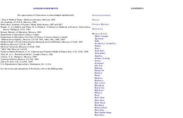 Detroit, Michigan, U. S. A., 1961 Botany, Ministry of Education, Moscow, 1963 Department of Agriculture, Ottawa, Canada Department of Agriculture, Province of Ontario, Toronto, Ontario, Canada‘ Medical Encyclopedia’, Moscow, U. S. S. R. 1961, 1966, 1967, 1968, 1969 Medical Plants U. S. S. R.( Lekarstvennye Rastenia), Kolos( Publisher), Moscow, U. S. S. R., 1967 Medicina, Moscow, U. S. S. R., 1965 Moscow University, Moscow, U. S. S. R., 1965“ Misl” Pub. Moscow, U. S. S. R. Naukova Dumka-Kotukow, G. N., Lekarstvennye Rastenia( Medical Plants); Kiev, U. K., S. S. R., 1966 Thut, Dr. A. J.,‘ Health from Herbs’, Gualph, Ontario, 1941 Teterev, V. A.,‘ Botanica’, Moscow, 1949 Vyashaya Schkola, Moscow, U. S. S. R., 1963 Zdorovie, Kiev, U. K., U. S. S. R., 1964 U. S. Department of Agriculture, Washington, D. C., U. S. A.