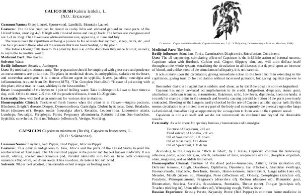 Common Names: Cayenne, Red Pepper, Bird Pepper, African Pepper. Features: This plant is indigenous to Asia, Africa and the parts of the United States beyond the southern line of Tennessee. The African Bird pepper is the purest and the best known medically. It is a small, oblong, scarlet, membraneous pod, divided internally into two or three cells containing numerous flat, white, reniform seeds. It has no odour, its taste is hot and acrid. Solvents: 98 per cent alcohol, considerable extent vinegar or boiling water.