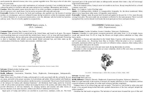 Due to its transient action, Catnip is more serviceable in tea form. Always steep the herb in a closed container, never boil. Dose: 1 oz. Catnip to 1 pint of boiling water. Adults: 2 – 3 tablespoonfuls, children 2 – 3 teaspoonfuls, frequently, for the above mentioned. When taken in very large doses when warm, it frequently causes emesis. Externally: Culpeper states the green herb bruised and applied to the part for 2 – 3 hr. eases the pain arising from piles. The juice made into an ointment is effective for the same purpose. There is an old saying that if the root be chewed it will make the most quiet person fierce and quarrelsome.