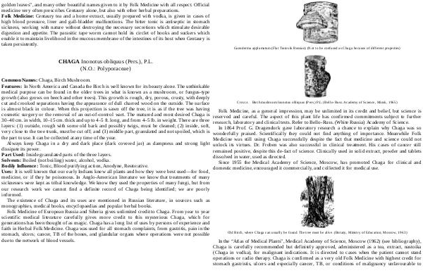 In the“ Atlas of Medical Plants”, Medical Academy of Science, Moscow( 1962)( see bibliography), Chaga is carefully recommended but definitely approved, administered as a tea, extract, nastoika( Chaga in vodka), for malignant indications. It is directed to cases when the patient cannot stand operations or radio therapy. Chaga is confirmed as a very old Folk Medicine with highest credit for stomach gastristis, ulcers and especially cancer, TB, or conditions of malignancy unfavourable to