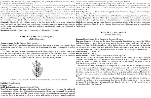 Medicinal Part: The root. Solvent: Water. Bodily Influence: Hepatic, Laxative, Diuretic, Tonic. Uses: The uses are much the same as Dandelion. The tender leaves can be chopped fine and mixed with salad greens. The tea from Chicory eliminates unwanted phlegm from the stomach that interferes with absorption and secretion of the internal system— in this way aiding in superfluous gall material— purifies the liver and spleen, is effective in uratic acid conditions of gout, rheumatics and joint