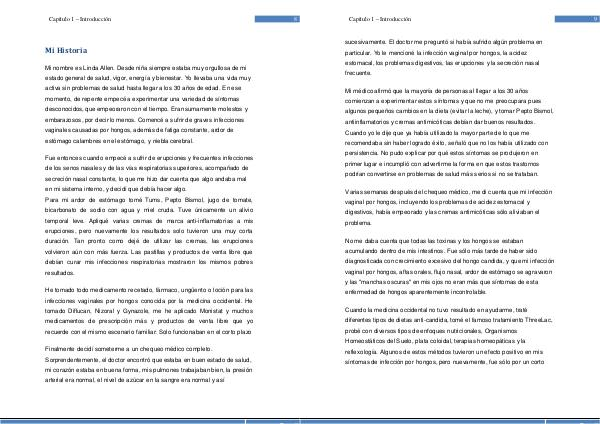 Capítulo 1 – Introducción 9 sucesivamente. El doctor me preguntó si había sufrido algún problema en particular. Yo le mencioné la infección vaginal por hongos, la acidez estomacal, los problemas digestivos, las erupciones y la secreción nasal frecuente.