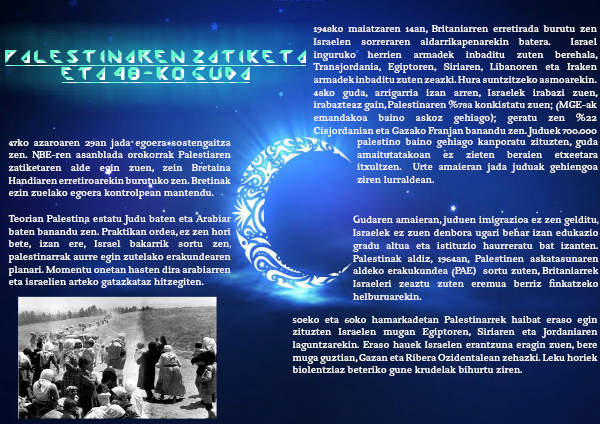 1948ko maiatzaren 14an, Britaniarren erretirada burutu zen Israelen sorreraren aldarrikapenarekin batera. Israel inguruko herrien armadek inbaditu zuten berehala, Transjordania, Egiptoren, Siriaren, Libanoren eta Iraken armadek inbaditu zuten zeazki. Hura suntzitzeko asmoarekin. 48ko guda, arrigarria izan arren, Israelek irabazi zuen, irabazteaz gain, Palestinaren %78a konkistatu zuen; (MGE-ak emandakoa baino askoz gehiago); geratu zen %22 Cisjordanian eta Gazako Franjan banandu zen. Juduek 700.000