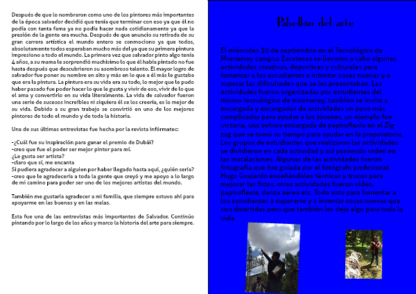 El miércoles 30 de septiembre en el Tecnológico de Monterrey campus Zacatecas se llevaron a cabo algunas actividades creativas, deportivas y culturales para fomentar a los estudiantes a intentar cosas nuevas y a superar las dificultades que se les presentaban. Las actividades fueron organizadas por estudiantes del mismo tecnológico de monterrey, también se invitó a encargada y encargados de actividades un poco más complicadas para ayudar a los jóvenes, un ejemplo fue victoria, una señora encargada de papiroflexia en el Zig zag que se tomó su tiempo para ayudar en la preparatoria. Los grupos de estudiantes que realizaron las actividades se dividieron en cada actividad y así poniendo orden en las instalaciones. Algunas de las actividades fueron fotografía que fue guiada por el fotógrafo profesional Hugo Guajardo enseñándoles técnicas y trucos para mejorar las fotos, otras actividades fueron video, papiroflexia, danza aérea etc. Todo esto para fomentar a los estudiantes a superarse y a intentar cosas nuevas que son divertidas pero que también les deja algo para toda la vida.