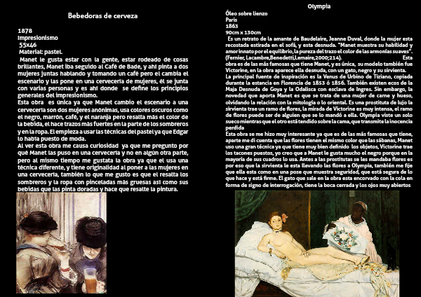 Al ver esta obra me causa curiosidad ya que me pregunto por qué Manet las puso en una cervecería y no en algún otra parte, pero al mismo tiempo me gustata la obra ya que el usa una técnica diferente, y tiene originalidad al poner a las mujeres en una cervecería, también lo que me gusto es que el resalta los sombreros y la ropa con pinceladas más gruesas así como sus bebidas que las pinta doradas y hace que resalte la pintura.
