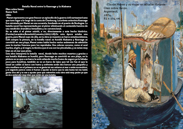 Esta obra interpreta la batalla naval, donde hubo muchos muertos y gracias a esa batalla Alabama se hundió, pero Kearsage se convirtió en una playa, en la pintura se ve que a un barco le está saliendo mucho humo de seguro ya le faltaba poco para hundirse, también se ve un barco de lejos que tal vez fue el que le lanzó un cañón al barco con humo y enfrente están dos barcos uno pequeño y otro mediano en el primero no se ve gente tal vez saltaron al mar o están escondidos, y el segundo parece como si fueran a ayudar al barco que le sale humo tal vez había gente viva ahí y la van a ayudar para que sobreviva esta obra está muy padre ya que se da a entender muy bien que están en una batalla.