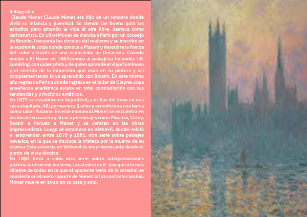 Claude Monet Claude Monet era hijo de un tendero donde vivió su infancia y juventud. So siendo tan bueno para los estudios pero amando la vida al aire libre, destaca como caricaturista. En 1859 Monet de marcha a Paris por un consejo de Boudin, frecuenta los círculos del realismo y se inscribe en la academia suiza donde conoce a Pissaro y descubre la fuerza del color a través de una exposición de Delacroix. Cuando vuelve a El Havre en 1862conoce al paisajista holandés J.B. Loneking, con quien pinta y de quien aprende el vigor luminoso y el sentido de la impresión que usan en su pintura y así complementando lo ya aprendido con Bousin. En este mismo año regresa a Paris a donde ingresa en el taller de Gleyne, cuya enseñanza académica estaba en total contradicción con sus tendencias y principios estéticos.