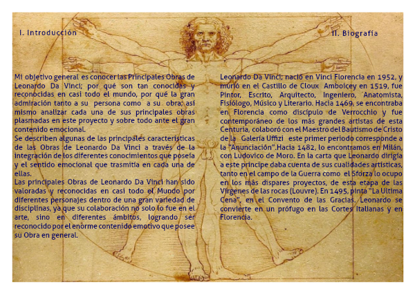 Leonardo Da Vinci; nació en Vinci Florencia en 1952, y murió en el Castillo de Cloux Amboicey en 1519, fue Pintor, Escrito, Arquitecto, Ingeniero, Anatomista, Fisiólogo, Músico y Literario. Hacia 1469, se encontraba en Florencia como discípulo de Verrocchio y fue contemporáneo de los más grandes artistas de esta Centuria, colaboró con el Maestro del Bautismo de Cristo de la Galería Uffizi este primer periodo corresponde a la “Anunciación”.Hacia 1482, lo encontramos en Milán, con Ludovico de Moro. En la carta que Leonardo dirigía a este príncipe daba cuenta de sus cualidades artísticas, tanto en el campo de la Guerra como el Sforza lo ocupo en los más dispares proyectos, de esta etapa de las Vírgenes de las rocas (Louvre). En 1495, pinta “La Ultima Cena”, en el Convento de las Gracias. Leonardo se convierte en un prófugo en las Cortes Italianas y en Florencia.