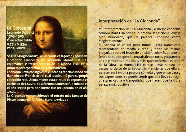 Segùn Giorgio Vasari; La Gioconda es la joven esposa del Florentino Francesco de Giocondo, Monna lisa. La enigmática y fresca sonrisa de la Monna Lisa, es la primera incorporación del renacimiento.