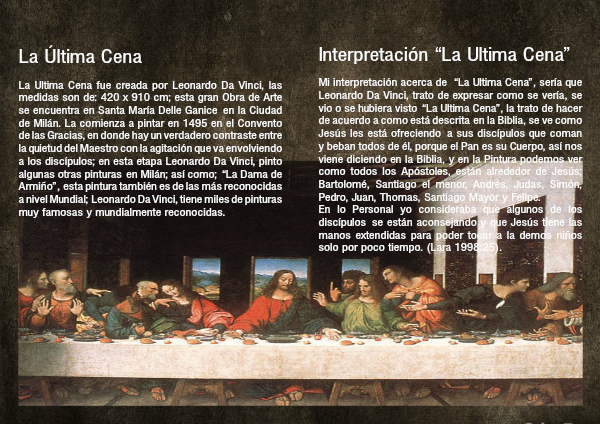 Mi interpretación acerca de “La Ultima Cena”, sería que Leonardo Da Vinci, trato de expresar como se vería, se vio o se hubiera visto “La Ultima Cena”, la trato de hacer de acuerdo a como está descrita en la Biblia, se ve como Jesús les está ofreciendo a sus discípulos que coman y beban todos de él, porque el Pan es su Cuerpo, así nos viene diciendo en la Biblia, y en la Pintura podemos ver como todos los Apóstoles, están alrededor de Jesús; Bartolomé, Santiago el menor, Andrés, Judas, Simón, Pedro, Juan, Thomas, Santiago Mayor y Felipe.