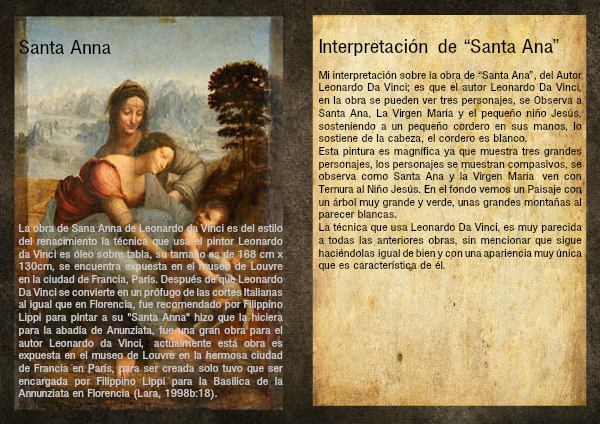 La obra de Sana Anna de Leonardo da Vinci es del estilo del renacimiento la técnica que usa el pintor Leonardo da Vinci es óleo sobre tabla, su tamaño es de 168 cm x 130cm, se encuentra expuesta en el museo de Louvre en la ciudad de Francia, París. Después de que Leonardo Da Vinci se convierte en un prófugo de las cortes Italianas al igual que en Florencia, fue recomendado por Filippino Lippi para pintar a su "Santa Anna" hizo que la hiciera para la abadía de Anunziata, fue una gran obra para el autor Leonardo da Vinci, actualmente está obra es expuesta en el museo de Louvre en la hermosa ciudad de Francia en París, para ser creada solo tuvo que ser encargada por Filippino Lippi para la Basílica de la Annunziata en Florencia (Lara, 1998b:18).