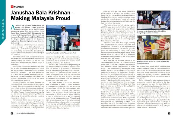 On her message for young aspirants , Janushaa encourages youths to be involved in the Navy as an engineer . She says the Royal Malaysian Navy offers training and courses for those keen on Mechanical and Electrical Engineering to become competent engineers . They have laid out easier pathways for Engineering Officers to gain professional titles such as Ir . since the technical requirements of the Navy and the Board of Engineers ( BEM ) are not far apart . She extols that “ The Navy is a great platform for engineers to gain experience and knowledge as beginners . Further down the pathway , there are other expert areas to explore to align with your career interest .” - Inforeach