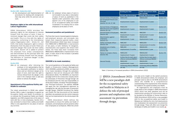 OSHA ( Amendment 2022 ) will be a new paradigm shift for the occupational safety and health in Malaysia as it defines the role of principal persons and emphasises risk assessment via prevention through design . provides some insight on the salient provisions in OSHA ( Amendment 2022 ), the employer and principal need to refer to full OSHA ( Amendment 2022 ) ( Act A1648 ) for a comprehensive understanding of the requirements of the statutory Act related to Occupational Safety and Health .