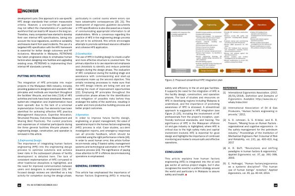 The integration of HFE principles into major projects in the Malaysian O & G industry , includes providing guidance to designers and operators . HFE principles and methods are important throughout the facilities ' lifecycle , and two lists [ 7,18 ] of HFE activities and tools have been developed . However , systematic integration and implementation have been sporadic due to the lack of a universal implementation formula . Five elements have been identified for achieving effective HFE practice ( Management Assurance , Expertise Allocation , Structured Process , Outcomes Measurement and Sharing Best Practices ). The current practices and experiences of industrial participants during the three general facilities lifecycle phases of engineering design , construction , and operation is reviewed in this article .