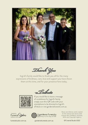 If you would like to leave a message of condolence for Ingrid ’ s family simply scan this QR code with your smartphone to be directed to Ingrid ’ s eTribute or visit gardeniafunerals . com . au