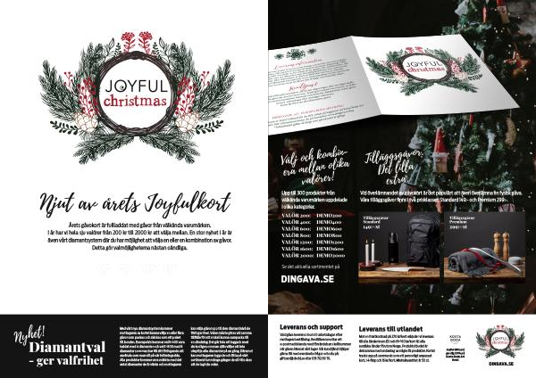 Årets gåvokort är fullladdat med gåvor från välkända varumärken . I år har vi hela sju valörer från 200 kr till 2000 kr att välja mellan . En stor nyhet i år är även vårt diamantsystem där du har möjlighet att välja en eller en kombination av gåvor . Detta gör valmöjligheterna nästan oändliga .