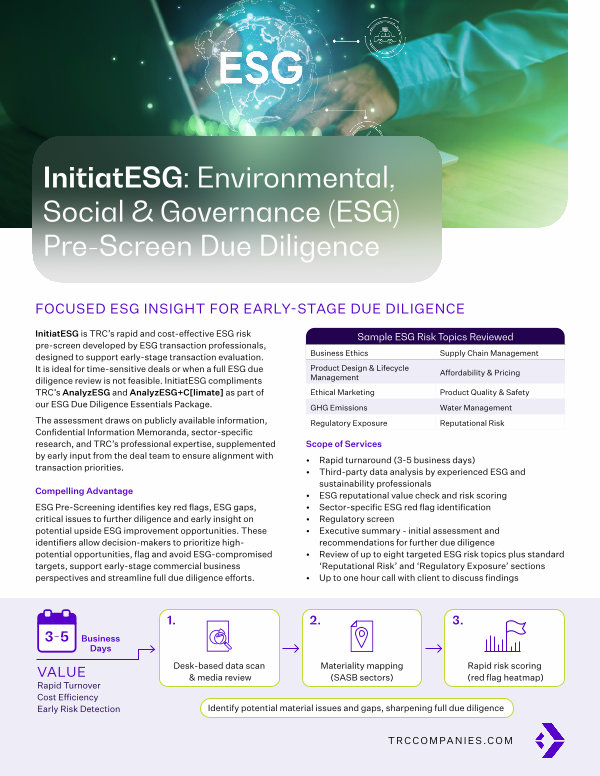 InitiatESG is TRC’ s rapid and cost-effective ESG risk pre-screen developed by ESG transaction professionals, designed to support early-stage transaction evaluation. It is ideal for time-sensitive deals or when a full ESG due diligence review is not feasible. InitiatESG compliments TRC’ s AnalyzESG and AnalyzESG + C [ limate ] as part of our ESG Due Diligence Essentials Package.