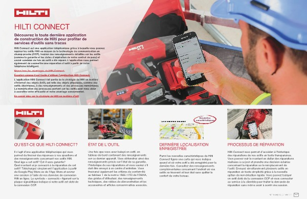 Hilti Connect vous permet d ' accéder à l ' historique des réparations de vos outils en toute transparence. Vous pouvez voir le montant en dollar des réparations réalisées à ce jour et prendre une décision éclairée concernant la réparation ou le remplacement de l ' outil. Envoyez simultanément plusieurs outils en réparation en toute simplicité grâce à la nouvelle option de numérisation rapide. Vous pouvez balayer un outil doté de la connexion CCP et vous connecter au service à la clientèle pour traiter la demande de réparation sans même avoir à ouvrir une session.